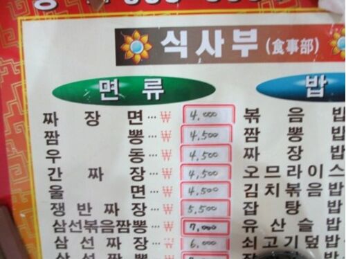 韓国へ行ったら必ず食べる好物のひとつがチャジャンミョンです写真は3年前の夏に行った薬令市の中にある中華屋さんのメニューチャジャンミョン 4000ウォン チャンポン 4500ウォン ウドン 4500ウォン 市場の中にあり配達もするというスタイルな…
