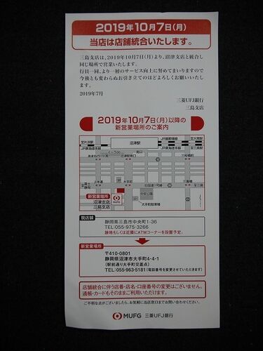 2019年10月7日(月)から三島の三菱UFJ銀行が移転して 沼津支店と統合するという連絡が来ました 昔は三和銀行でしたね その前は何があったのか思い出せません 都市銀行としては、みずほ銀行が残っていますが それも撤退するかもしれませんね 金融業界…