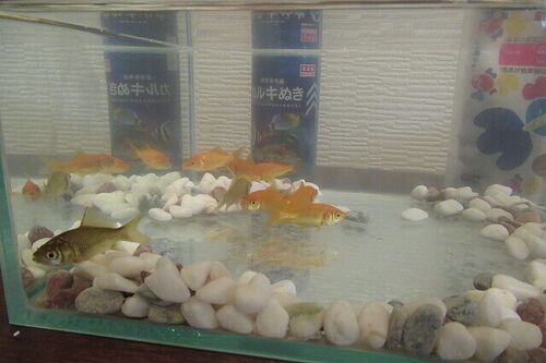 孫たちが大社のお祭りで すくってきた金魚を置く場所が無いというので 私の家の玄関に置いてあります 孫が来て水を替えたり餌をやります おかげで目の保養ができていいですね