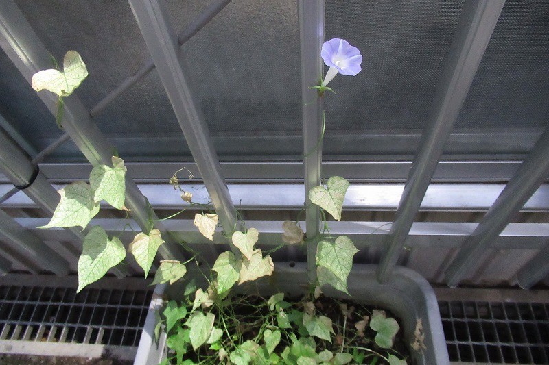 2022-09-02 けなげ 歳時記 ぜんぜん陽の当らない場所に置いておいた朝顔です 葉も小さく背丈も伸びません でもちゃんと花が咲きました 直径が3センチぐらいの小さな花ですが 健気ですね これを見たら、置かれた場所で花を咲かせなさいという 言葉を思い出しました