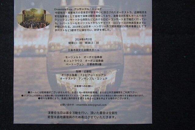 2024-05-25 アンサンブル・エシュテ 音楽 おしらせ 6月2日に三島のゆうゆうホールでアンサンブル・エシュテのコンサートがあります オーボエ協奏曲とベートーベンの8番 楽しみですね 無料ですが能登半島地震に寄付をしてくださいとのこと いいことですね!!